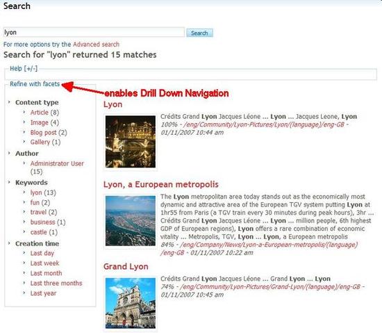 Along the main query, the facets, mentioned in Customization, let you drill down into the results and thus offering you a more sophisticated navigation. This drill down navigation is helpful because users often start with a vague idea of what they are looking for or they might use a broad search phrase. The results from the initial search are returned in relevant categories and show how many search results there are from each of those categories. By clicking on the links for the categories, the search is filtered and narrowed so that users can drill down to pinpoint exactly what they need. The available categories can be customized based on the logical structure of the site content.
