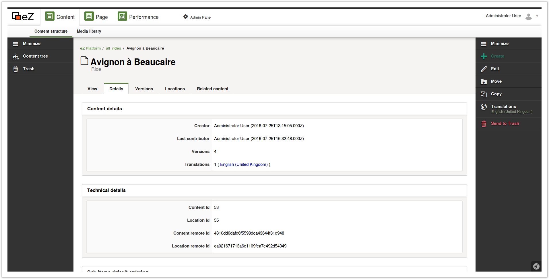 You can also go the the URL of the content. It is a URL like this one http://127.0.0.1:8000/view/content/53/eng-GB/full/true/55 where 53 is the Content ID and 55 is the Location ID of my Ride.